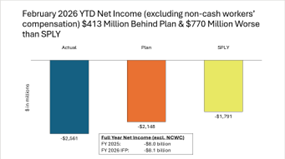 The USPS on March 24, 2026, filed its preliminary financials for February 2026 with the Postal Regulatory Commission (PRC).  For February 2026 year-to-date, the USPS net income (excluding non-cash workers’ compensation) was $413 million less than its Plan and $770 million worse than the same period last year (SPLY).  Volume year-to-date continues to be below SPLY, largely due to last year’s election mail volumes.  Revenue year-to-date is similar to last year, as can be seen below.
