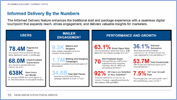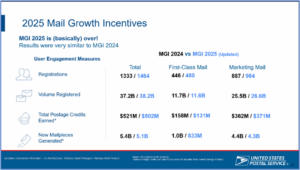 Mail Growth Incentive Program.  The USPS shared a comparison of participation in the Mail Growth Incentive program from 2024 to 2025 (see slide to right), as well as info on the 2026 program.  The registration period for the 2026 program began in March 2026 and ends May 30, 2026.  Those who participated in the 2025 program should be automatically enrolled by the USPS’ system.  The USPS said it has approved about 400 participants so far, is in discussions with about 80 and is waiting for information from customers for about 1100.  There are no significant changes in the program for 2026 compared to 2025.