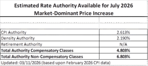 The CPI price cap authority for a July 2026 market dominant postage rate adjustment is now 2.613 percent.  This reflects not only the release of the February 2026 CPI, but also the Postal Regulatory Commission’s (PRC) new method for addressing the missing October 2025 CPI.  See table below for the total July 2026 rate authority.  The USPS is expected to file its proposed price changes for July at the PRC before April 10, 2026 (when the March CPI is released).
