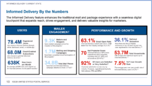 Informed Delivery Update.  The USPS gave an update on its Informed Delivery program (see slide right), noting that campaigns continue to increase.  The USPS surveys users every six months or so to obtain feedback on issues, enhancements, etc. It is proposing enhancements to the mailer portal and other tools, focusing on helping small/medium mailers.
