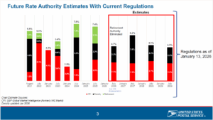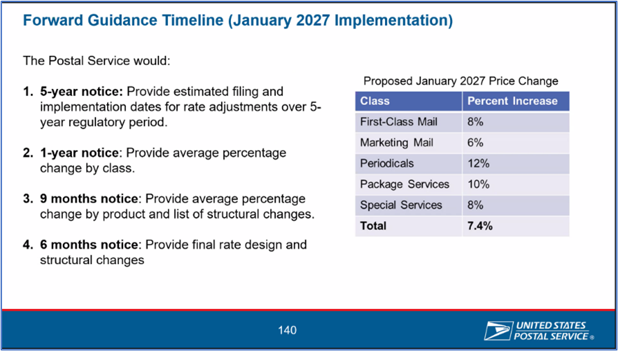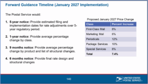 Lastly, for the years beyond 2026, the below forecast does not take into account any changes the PRC might implement to the USPS rate system. For example, the “regulatory monitoring approach” proposed by the USPS could result in a January 2027 price change because it would be in a different USPS Fiscal Year than the July 2026 change. One approach proposed by the USPS would increase prices by 22% over 5 years.