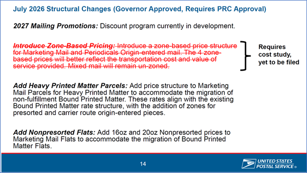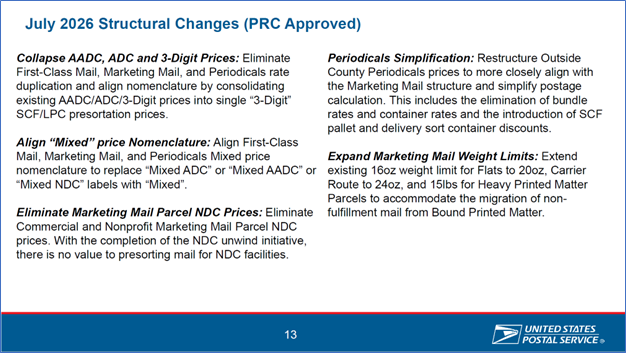 The first slide shows changes already approved by the Postal Regulatory Commission (PRC) and the second slide shows changes that have been approved by the USPS Board of Governors for July 2026 implementation but which still need approval from the PRC. Note that the introduction of zone-based pricing for Marketing Mail and Periodicals origin-entered mail will not be introduced in July 2026 as the USPS had previously planned since the PRC has ruled the USPS needs to file a cost study to support its proposed changes.