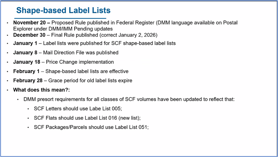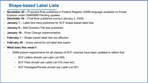 - Shape-Based Labeling List Changes. As noted in the last Alliance Report, the USPS is implementing shape-based labeling lists for SCF entry discounts, effective Feb. 1, 2026. A reference is included in the most recent Postal Bulletin, and the detailed list of shape-based DMM changes can be found here in Postal Explorer. The USPS shared the below slide at last week’s MTAC meeting with the timeline for using the new labeling lists: