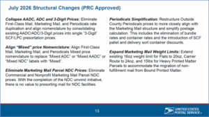 In addition to the above-referenced price change the USPS plans to implement July 12, 2026, there are also structural changes it plans to make. The USPS at this week’s meeting of the Mailers Technical Advisory Committee (MTAC) shared the below slides recapping the planned structural changes.
